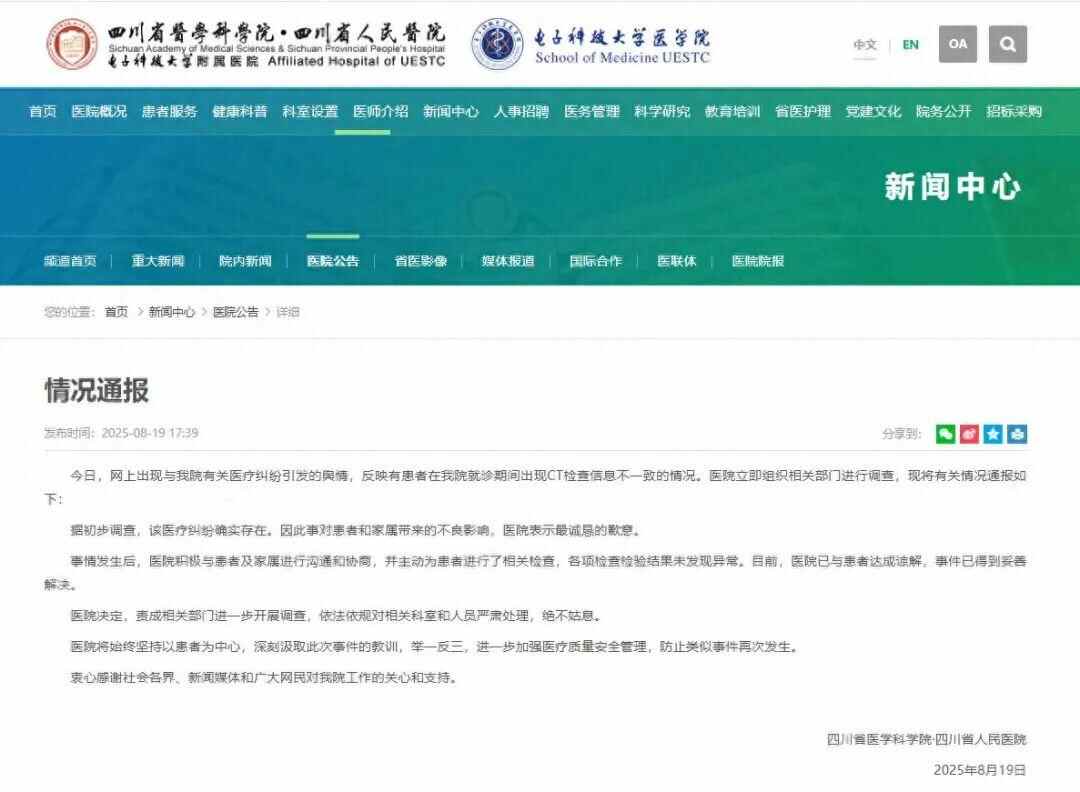 8月19日,四川省人民医院发布情况通报: