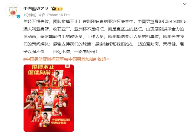 当地时间8月17日,2025男篮亚洲杯决赛在沙特吉达落幕。中国男篮与卫冕冠军澳大利亚鏖战至最后一秒,最终以89-90一分之差惜败,收获亚军。这是中国队自2015年后首次重返亚洲杯决赛,创近十年最佳战绩。胡明轩空砍全场最高26分(命中5记三分),胡金秋贡献20分10篮板两双数据,王俊杰、赵睿等人合力打出团队篮球。