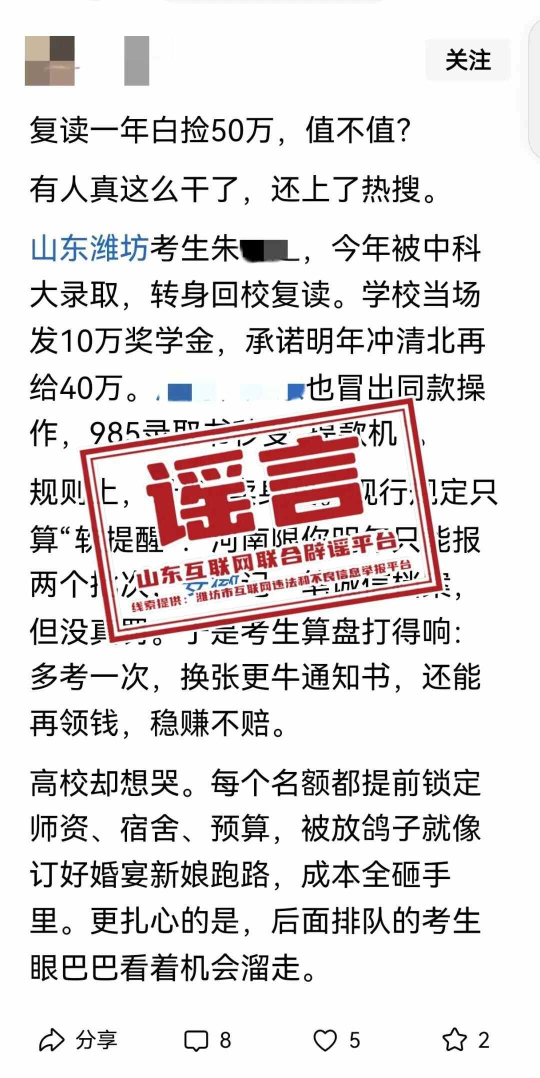 近日,网络上流传着一则关于“潍坊考生朱某某复读考名校套取高额奖学金”事件信息。经核实,山东潍坊没有此名字的高考生,“潍坊一考生复读考名校套取高额奖学金”的说法是谣言。
