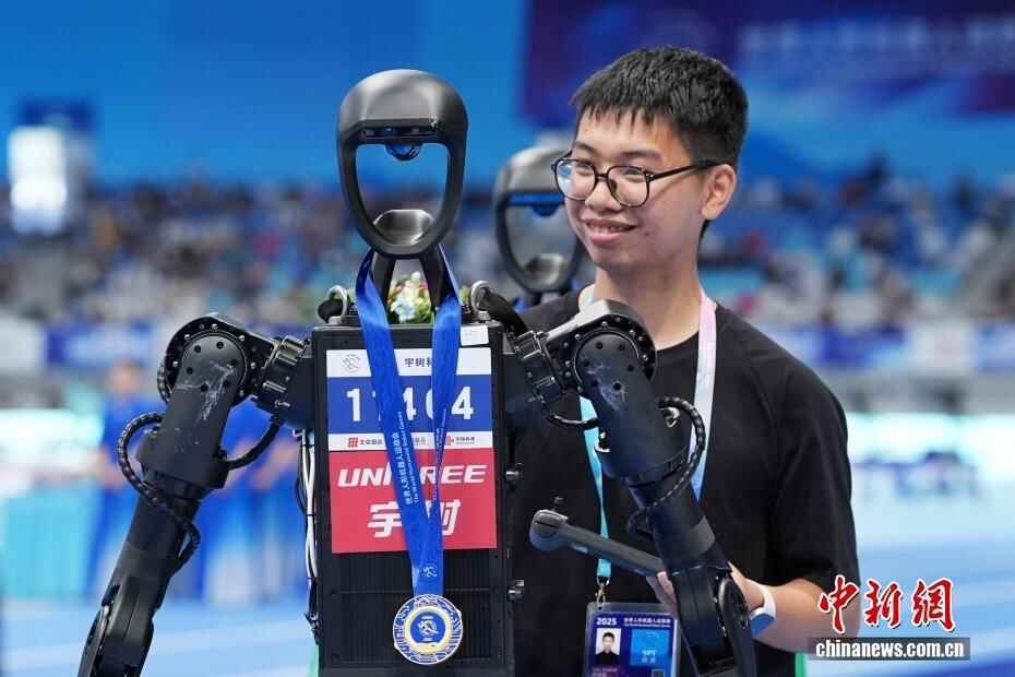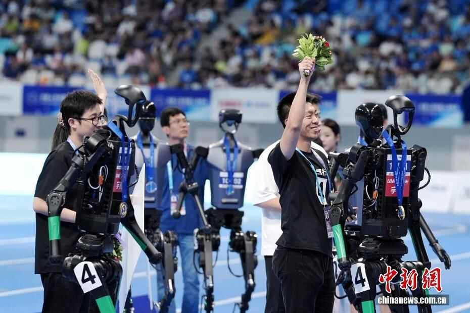 8月17日,在北京国家速滑馆(冰丝带)举行的2025世界人形机器人运动会上,宇树科技队以1分48秒78的成绩获4x100米接力赛冠军。图为宇树科技队参赛队员在夺冠后庆祝。中新社记者 张祥毅 摄