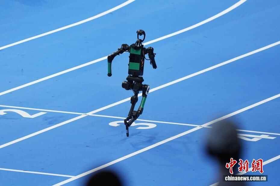 8月17日,在北京国家速滑馆(冰丝带)举行的2025世界人形机器人运动会上,宇树科技队以1分48秒78的成绩获4x100米接力赛冠军。图为宇树科技队的人形机器人率先冲线。中新社记者 张祥毅 摄