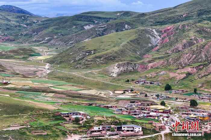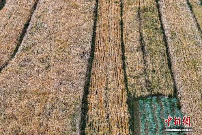 图为收割青稞场景。(无人机照片)中新社记者 薛蒂 摄