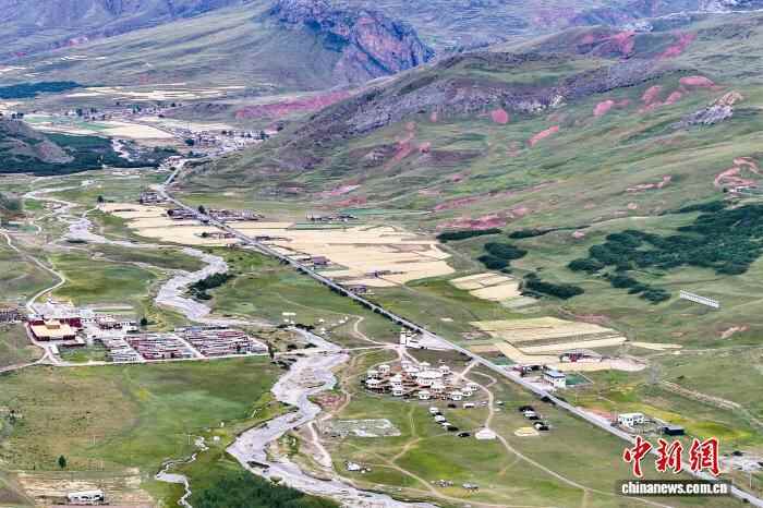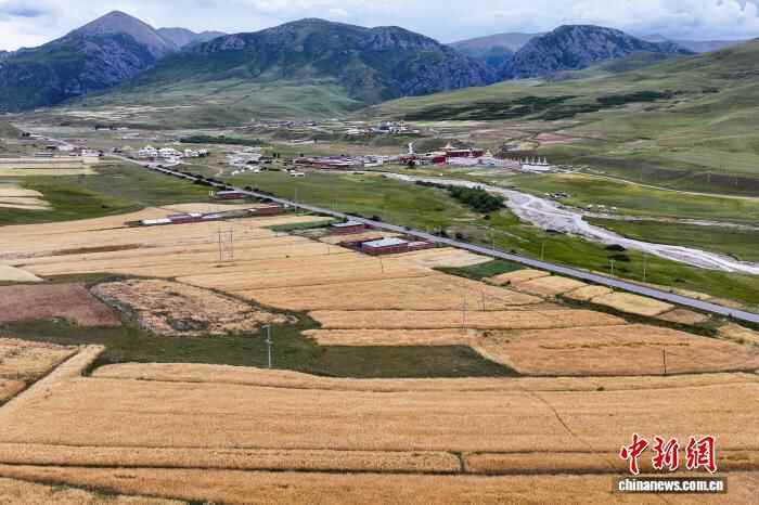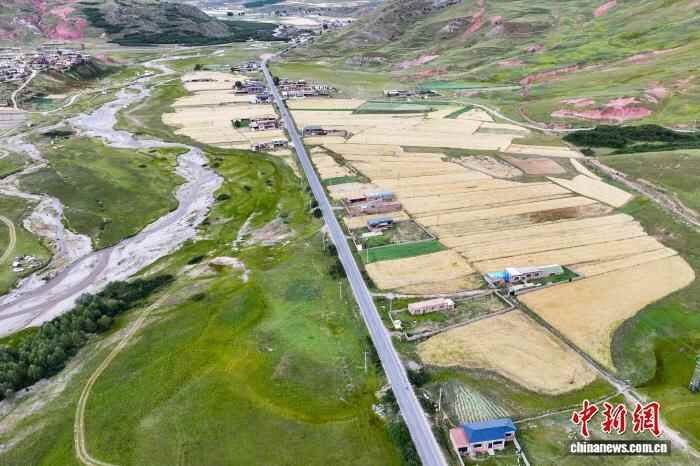 图为道路两旁成熟的青稞。(无人机照片)中新社记者 薛蒂 摄