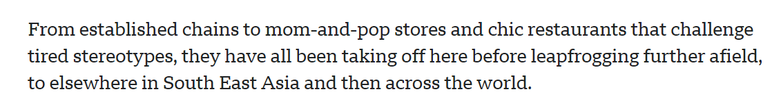 文章说,中国烹饪技艺源远流长、博大精深,一桌美食盛宴或许正是中国最有效却又最被低估的吸引力所在。还是以新加坡为例,商场、公交和地铁站里,搭配着中国成语的中国美食巨幅亮眼广告不时闪现。从连锁巨头到夫妻小店,再到颠覆刻板印象的时尚餐厅,这些中国美食品牌在向东南亚乃至全球扩张前,都已在这个国际旅游城市崭露头角。