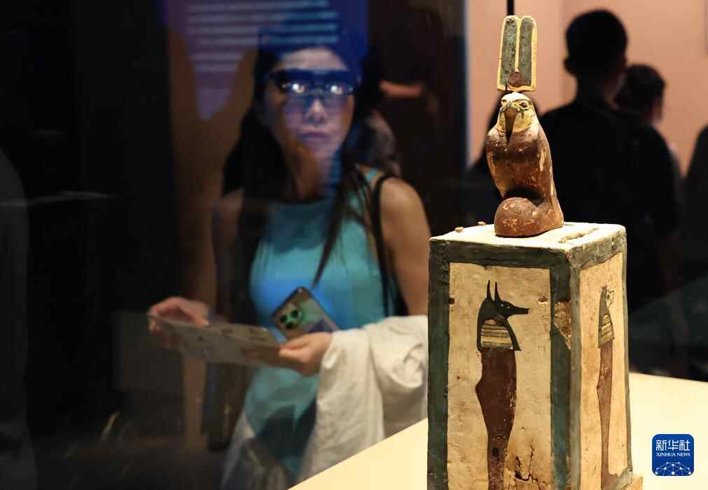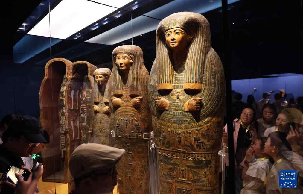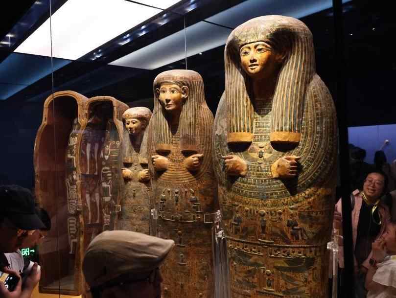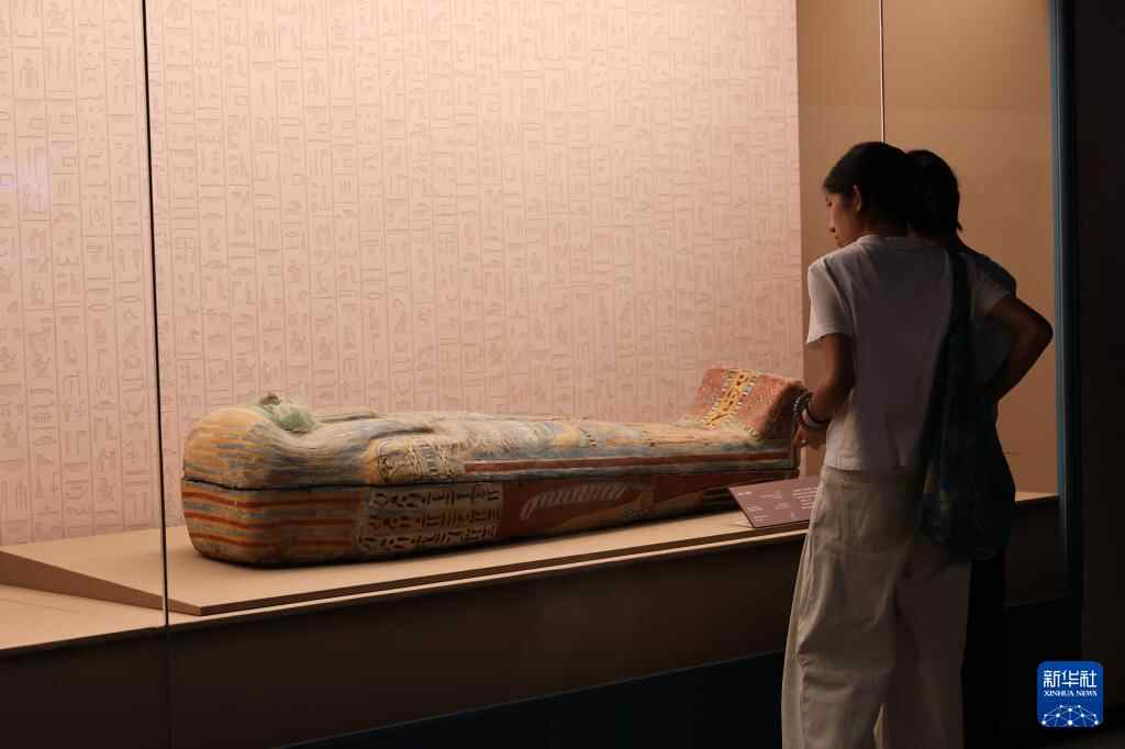 8月17日,观众在阿蒙纽特纳赫特彩绘人形内棺前驻足观看。
