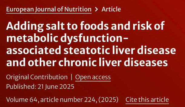 2025年6月,发表在《欧洲营养学杂志》期刊上的一项研究发现:减少食物中的盐分有助于保护肝脏。经常在食物中盐摄入超标的人,患脂肪肝、肝硬化甚至肝癌风险会增加。