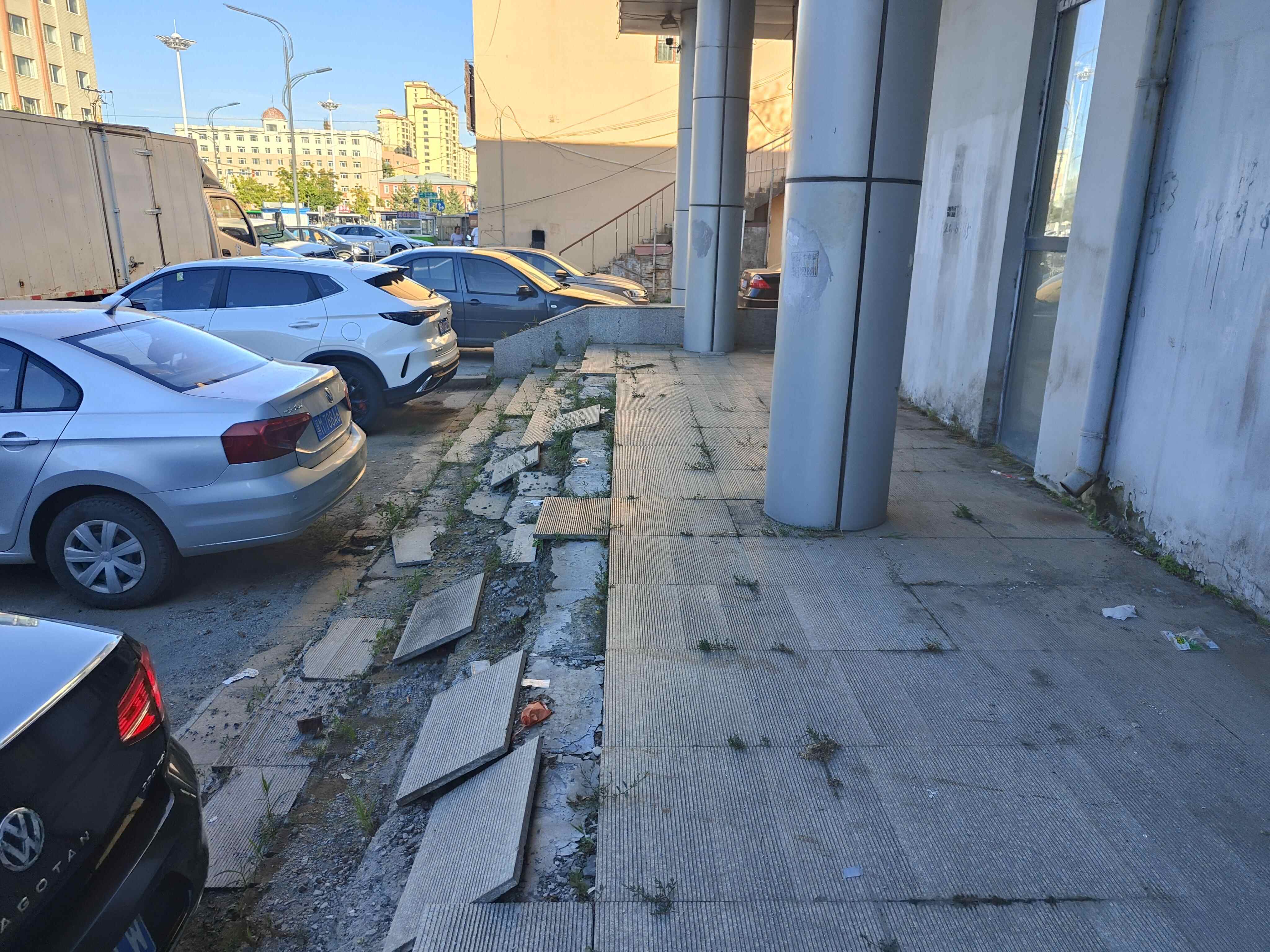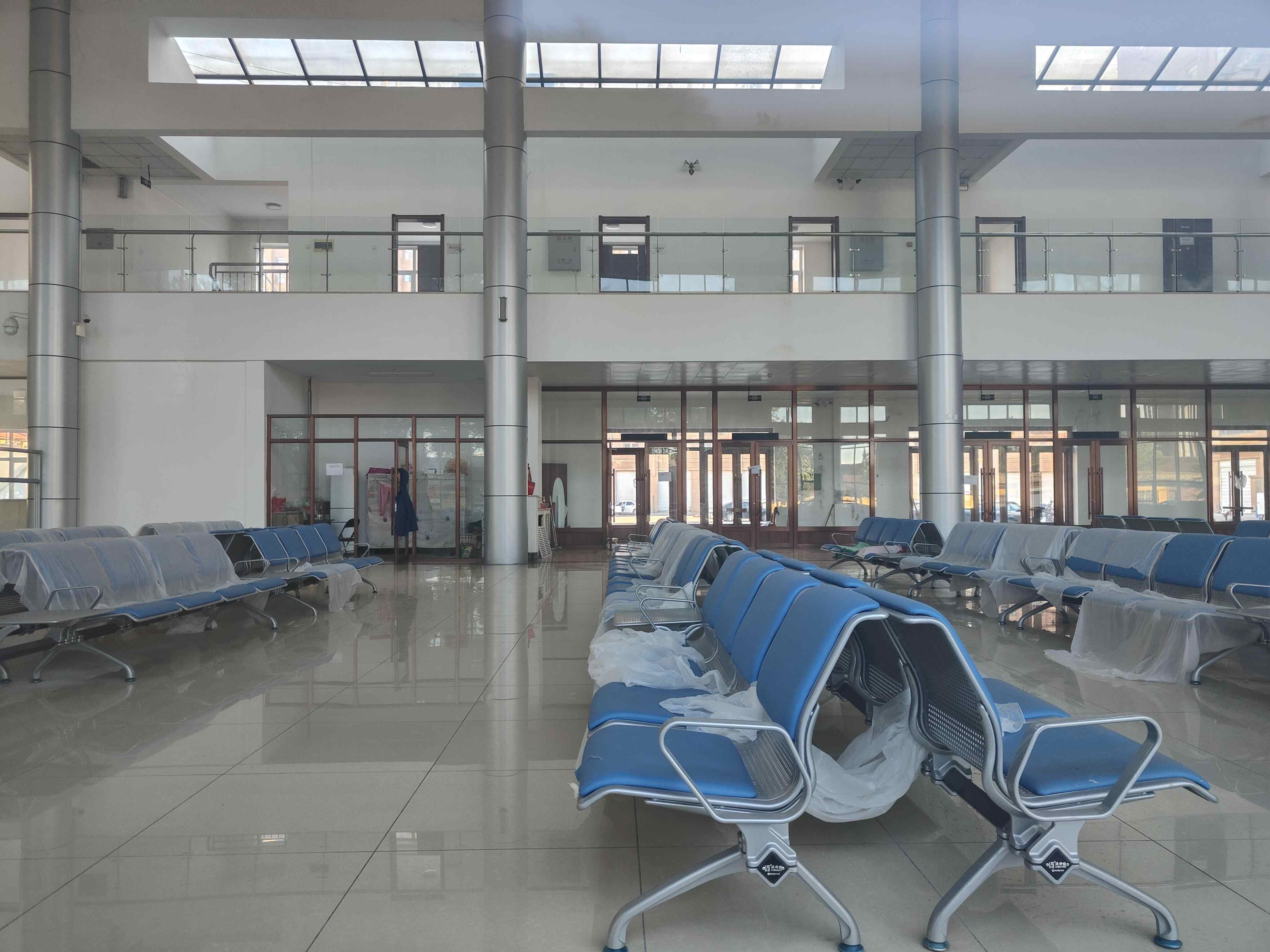 走到近前,客运站候车厅北侧主入口的大门紧锁,门前地面坑坑洼洼,横七竖八停着几十辆汽车。客运站的外立面已经出现不少破损,墙面脱落、玻璃碎裂。透过玻璃窗往里看,候车厅里十分空旷,摆放着成排的座椅,许多座椅上还覆盖着塑料包装布。