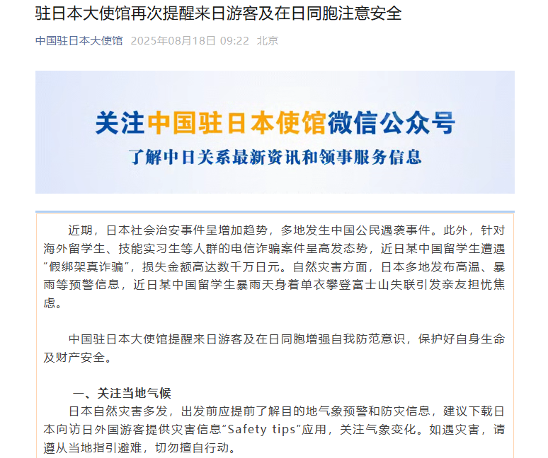 8月18日,中国驻日本大使馆发文提醒——