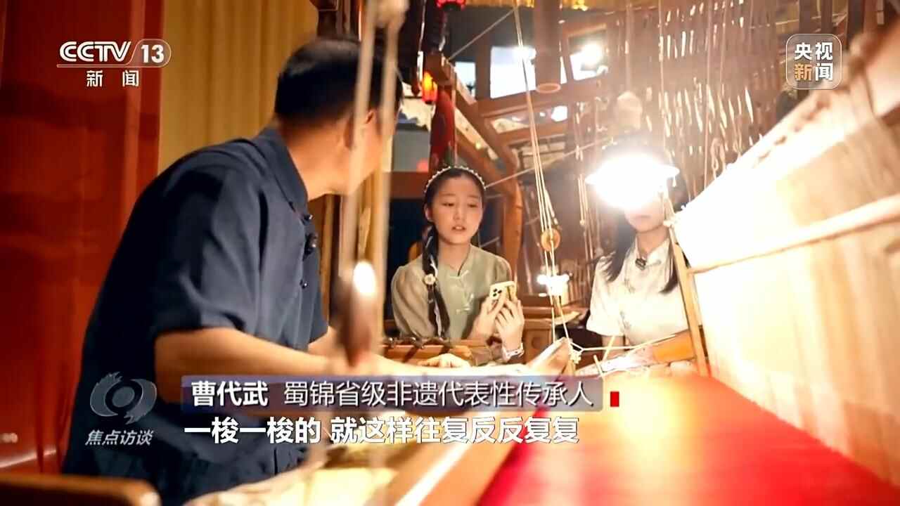 蜀锦省级非遗传承人 曹代武:梭子从这个开口里边过来,然后我就把纬线编织到里面了,织出来就是你现在看到的这个唐代的五彩鸟纹样。再来一梭,一梭一梭的,就这样反反复复。