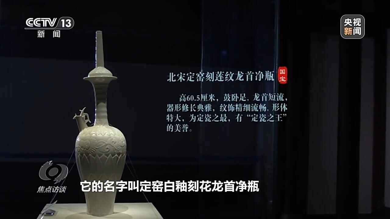 第三件镇馆之宝是定窑白釉刻花龙首净瓶,这是目前存世的北宋早期全世界体量最大、最完整的一件定瓷。