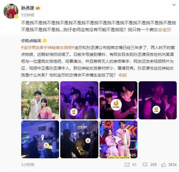 当天下午,孙丞潇转发网友爆料内容,连发15个“不是我”紧急回应,称:“不是我不是我不是我不是我不是我不是我不是我不是我不是我不是我不是我不是我不是我不是我不是我…这有没有可能不是我呢?我只有一个美女@金莎。”