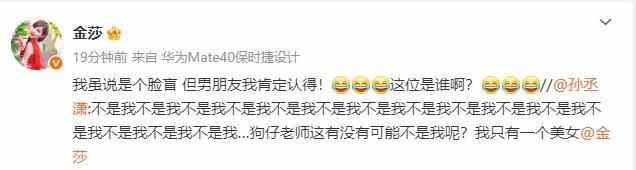随后金莎也发文回应,称:“我虽说是个脸盲,但男朋友我肯定认得!这位是谁啊?”