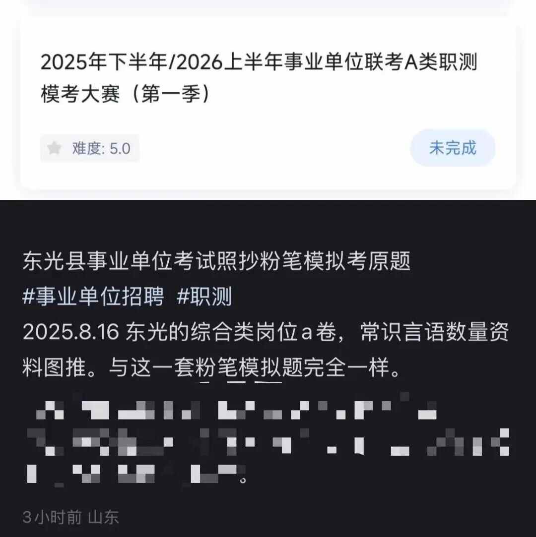 8月18日,记者通过整理网友评论发现,东光县事业单位公开招聘考试部分试题疑“照抄照搬”粉笔App2025年下半年/2026年上半年事业单位联考A类职测模考大赛(第一季),记者随后联系到粉笔App客服,据其介绍,该套模拟题于7月18日上线。