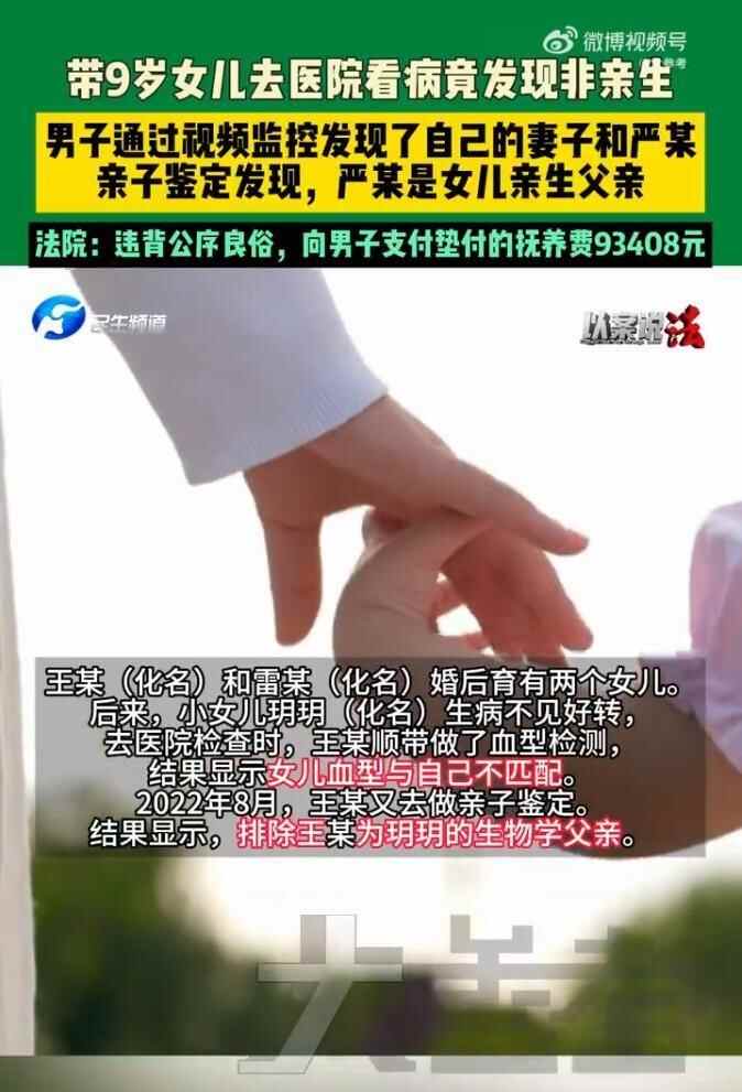 湖北枣阳。王某和雷某(均为化名)婚后育有两个女儿,有次王某带9岁的小女儿去看病时,顺便做了血型检测,竟然发现小女儿可能非自己亲生。随后通过亲子鉴定证实了这一猜测,但妻子雷某却否认鉴定书的真实性。王某经过调查,怀疑严某(化名)是小女儿的生父,通过亲子鉴定也证实了这一猜测。王某一气之下将严某告上法庭,索要114036元的抚养费。