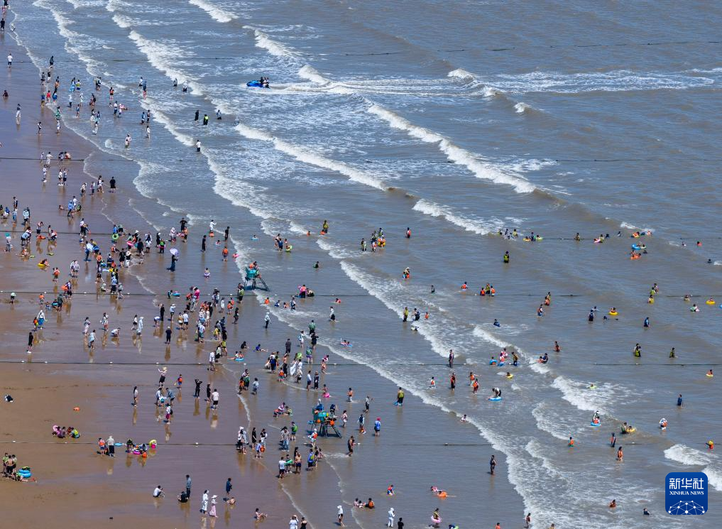 8月12日,游客在朱家尖南沙景区的海滩上游玩(无人机照片)。