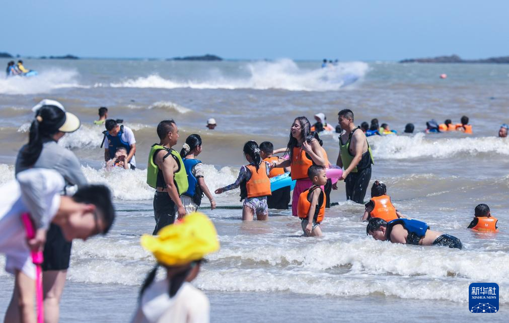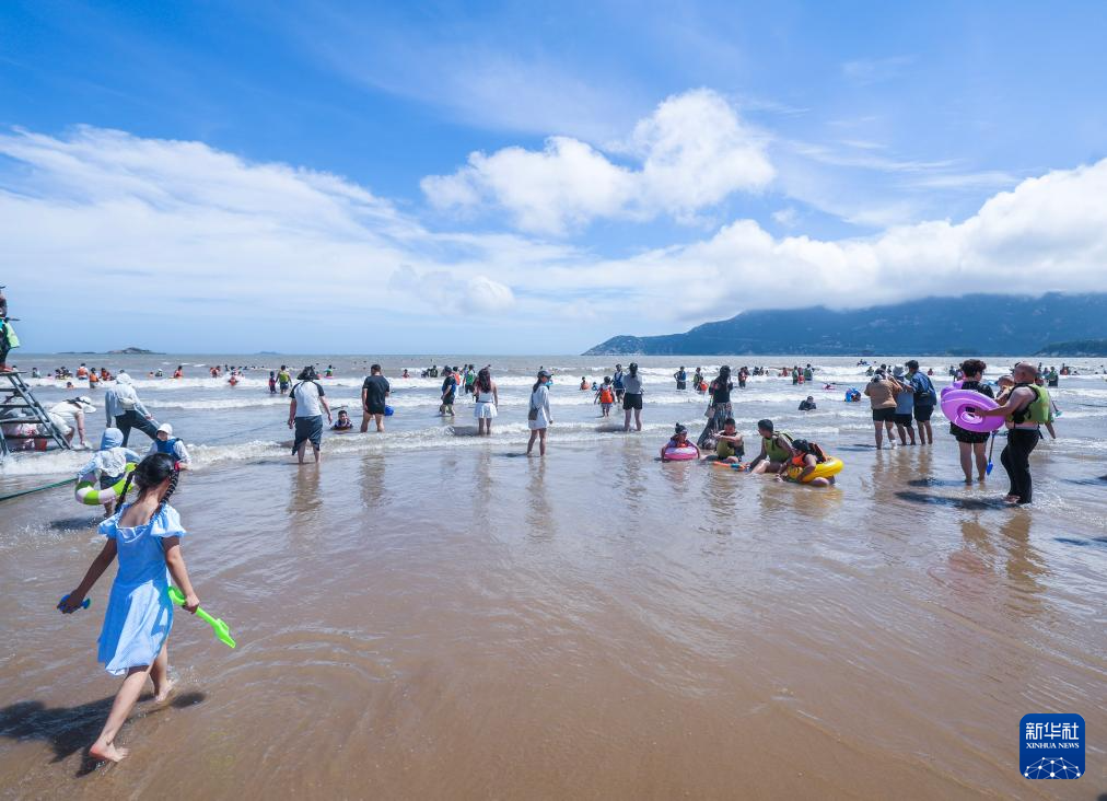 8月12日,游客在朱家尖南沙景区嬉水。