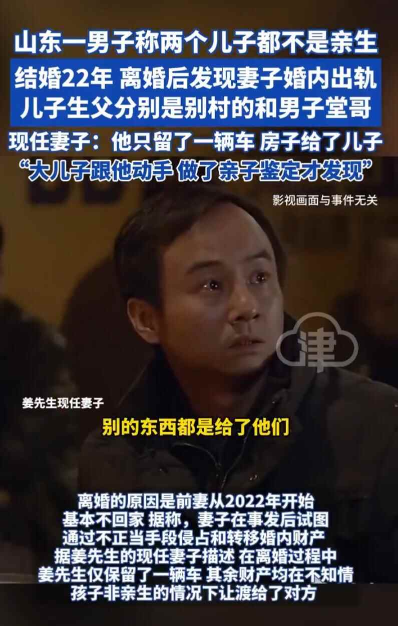 8月13日(报道),据潮新闻、江北融媒,山东淄博男子姜先生在结婚22年后发现,其与妻子所育的两个儿子均非亲生,长子的生父为妻子前村的村书记,次子的生父则是姜先生的亲堂哥。