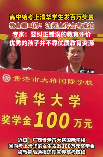 日前,广西贵港一女生考上清华大学,所在高中学校奖励其100万元奖学金。近日,贵港市教育局一则内部通报显示将该校的重金奖励行为定性为违规宣传高考成绩。