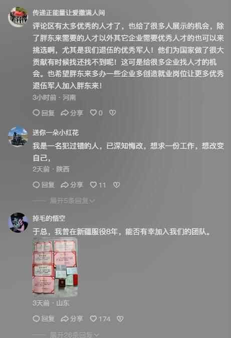 据悉,此次胖东来新乡三店的招聘,规划了百分之二十的名额给退伍边防军人,还有百分之二的名额给有犯罪史的服刑人员。一时间,求职的网友们纷纷在于东来社交账号的评论区留言报名,截至目前,于东来发布招聘消息的一条视频,有近两万条评论,大多是网友“在线求岗”的信息。