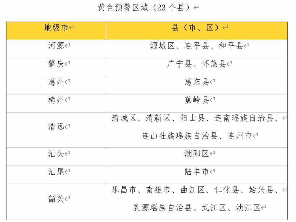 河源源城区、连平县、和平县,肇庆广宁县、怀集县,惠州惠东县,梅州蕉岭县,清远清城区、清新区、阳山县、连南瑶族自治县、连山壮族瑶族自治县、连州市,汕头潮阳区,汕尾陆丰市,韶关乐昌市、南雄市、曲江区、仁化县、始兴县、乳源瑶族自治县、武江区、浈江区,局地发生山洪灾害可能性较大(黄色预警)。