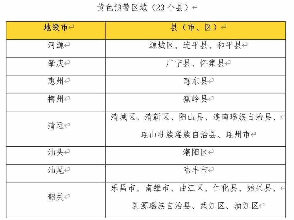 河源源城区、连平县、和平县,肇庆广宁县、怀集县,惠州惠东县,梅州蕉岭县,清远清城区、清新区、阳山县、连南瑶族自治县、连山壮族瑶族自治县、连州市,汕头潮阳区,汕尾陆丰市,韶关乐昌市、南雄市、曲江区、仁化县、始兴县、乳源瑶族自治县、武江区、浈江区,局地发生山洪灾害可能性较大(黄色预警)。