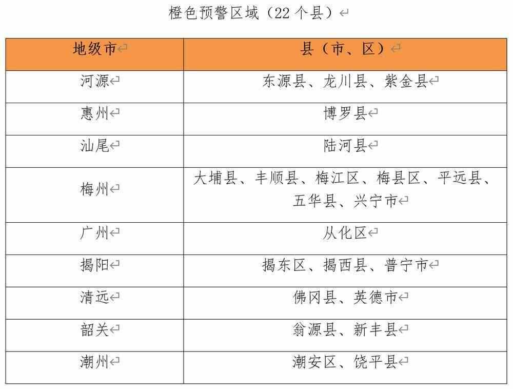 河源东源县、龙川县、紫金县,惠州博罗县,汕尾陆河县,梅州大埔县、丰顺县、梅江区、梅县区、平远县、五华县、兴宁市,广州从化区,揭阳揭东区、揭西县、普宁市,清远佛冈县、英德市,韶关翁源县、新丰县,潮州潮安区、饶平县,局地发生山洪灾害可能性大(橙色预警)。
