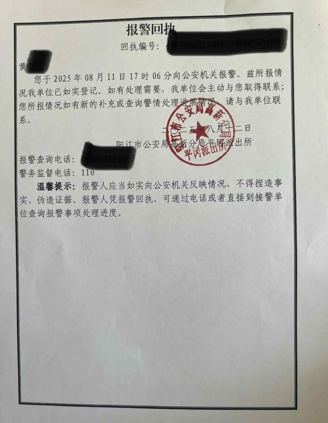 这名男子发出了买药的发票和店员与他老婆的聊天记录,还发出了一张阳江市公安局高新分局平冈派出所8月12日开出的报警回执,显示其于2025年8月11日17时06分报警,情况已经如实登记,如有处理需要,会主动联系。