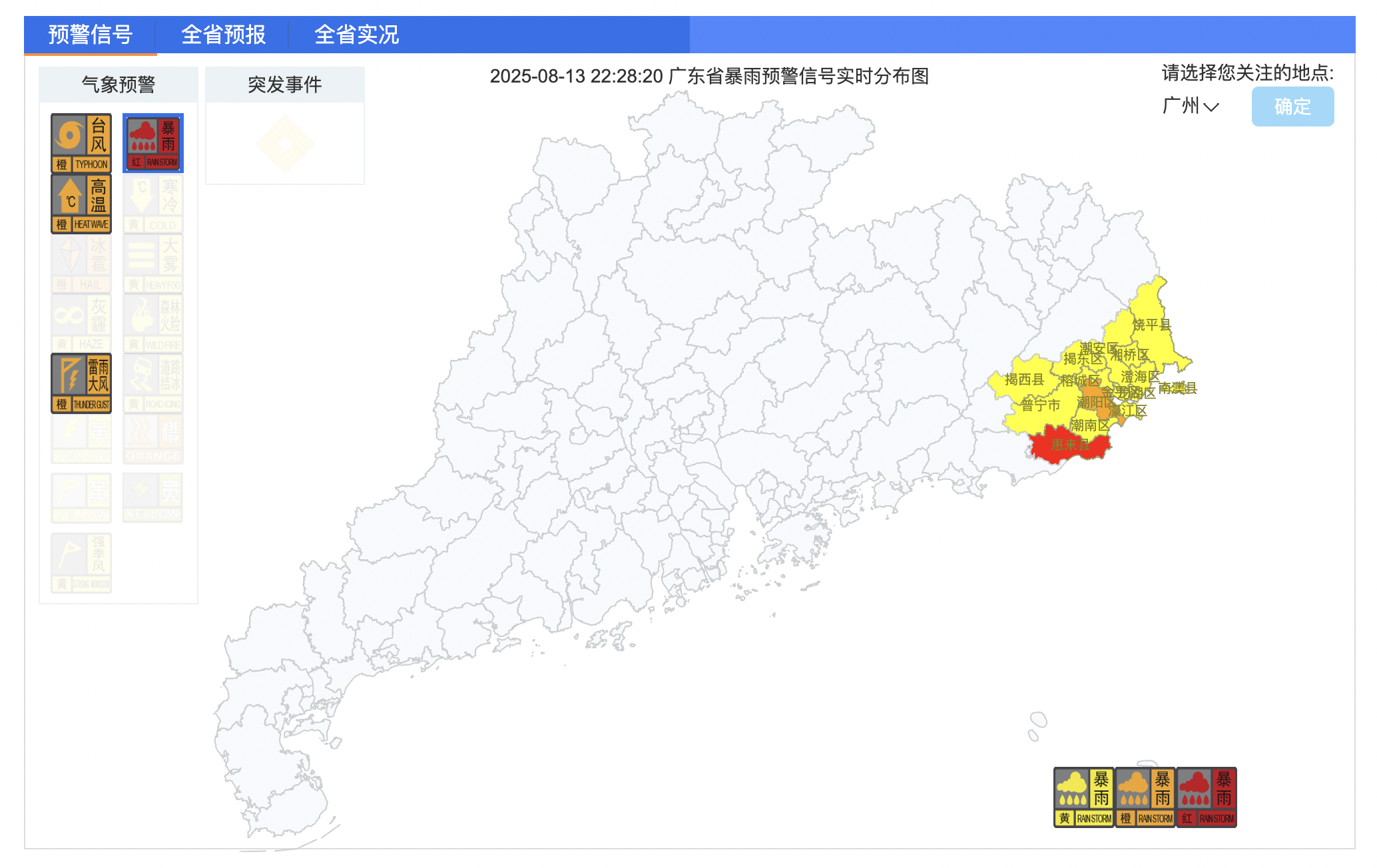 根据广东省气象部门观测和统计,截至8月13日22时,受台风“杨柳”螺旋雨带影响,过去1小时揭阳惠来县前詹镇出现13级阵风(40.7米/秒),揭阳惠来县靖海镇出现1小时87毫米强降水。截至13日22时28分,惠来发布暴雨红色预警信号;除惠来外,其他受“杨柳”螺旋雨带影响的粤东沿海地区,发布暴雨黄色至橙色预警信号。