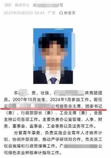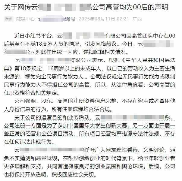 另据上游新闻报道,南宁市武鸣区市场监督管理局城厢市场监督管理所工作人员证实,云某某科技有限公司法定代表人确为17岁。“根据相关法规,16至18岁之间的人,如果要担任管理人员职务,必须提供证明材料,能够证明其具备完全民事行为能力,否则只能作为公司股东。”该工作人员介绍,通常这类证明材料会涉及劳动能力、收入状况、独立生活能力等,“从登记信息看,这家公司是真实存在的,应该是提交了证明材料并通过了注册登记申请。”
