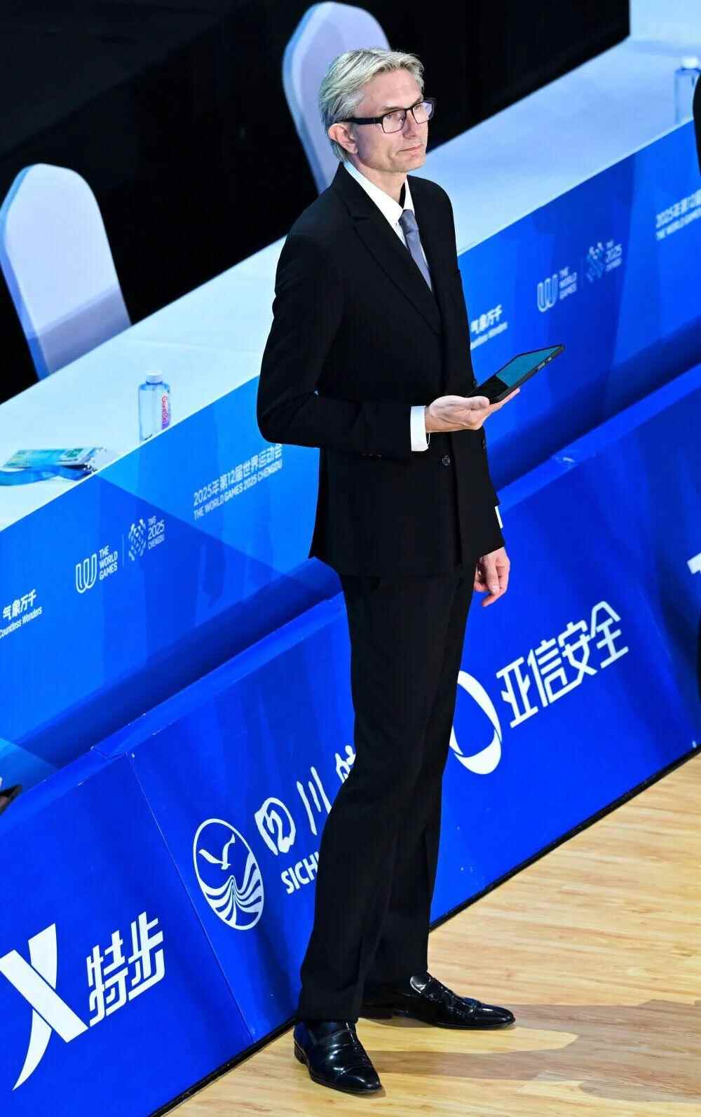 1970年出生的辛金斯来自拉脱维亚,7岁开始跳舞,先是职业舞者,后来退役转做教练与裁判。2024年无锡的亚洲体育舞蹈节,他第一次来中国执裁。成都世运会,是他的第二次中国之旅。