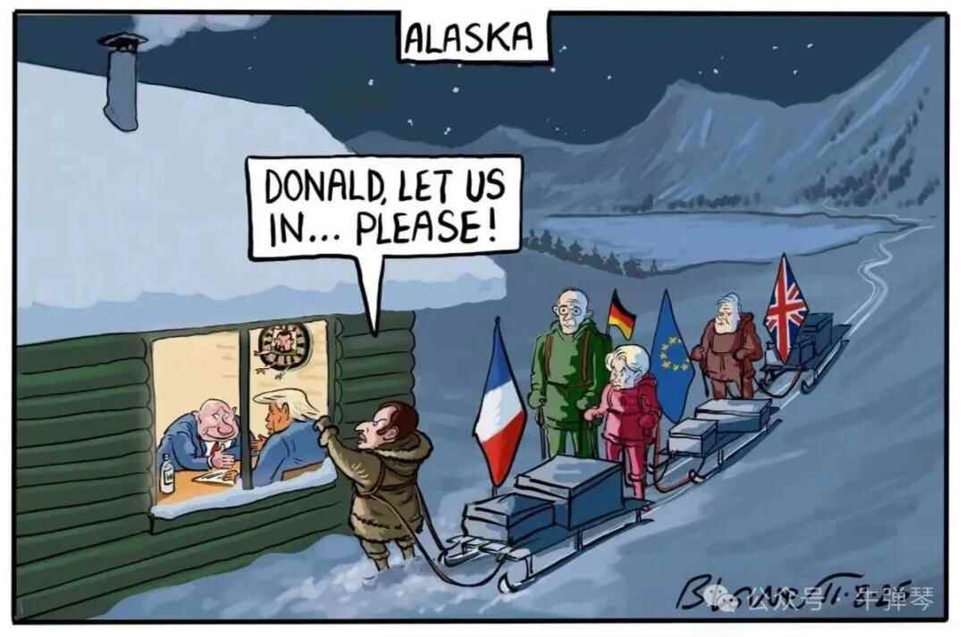 漫画里,特朗普和普京,正在冰天雪地的阿拉斯加小屋里亲密交谈;一连串的飞镖,已经钉在了画着泽连斯基的标靶上;屋外,冻得瑟瑟发抖的欧洲领导人,则在努力敲着窗……