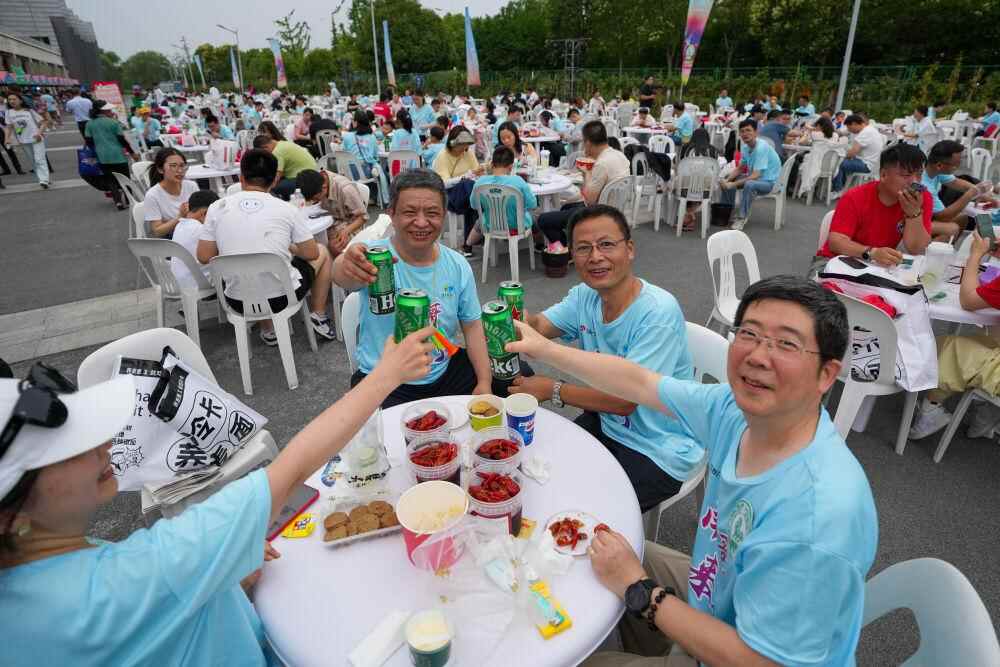 球迷在江苏淮安“苏超”市集品尝美食特产。新华社记者 李博 摄
