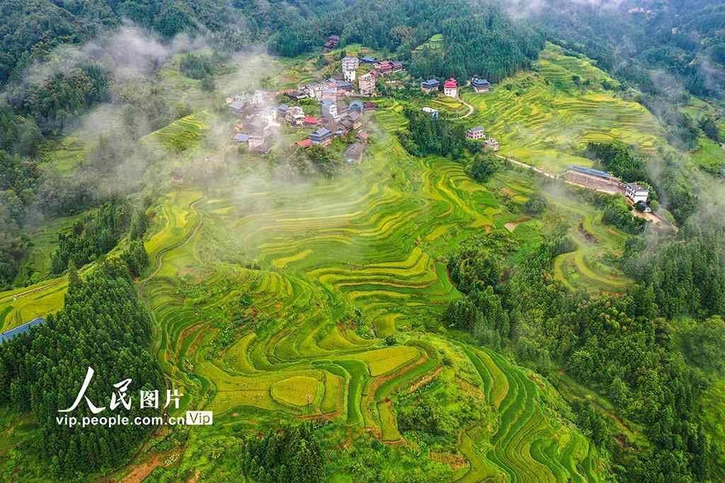 立秋时节,地处苗山深处的广西融水苗族自治县苗寨里的水稻陆续成熟,黄绿相间的梯田与古老的吊脚楼、翠绿的青山、缭绕的晨雾及蓝天白云相映成景,构成一幅和美乡村“丰”景画。龙林智摄(人民图片网)