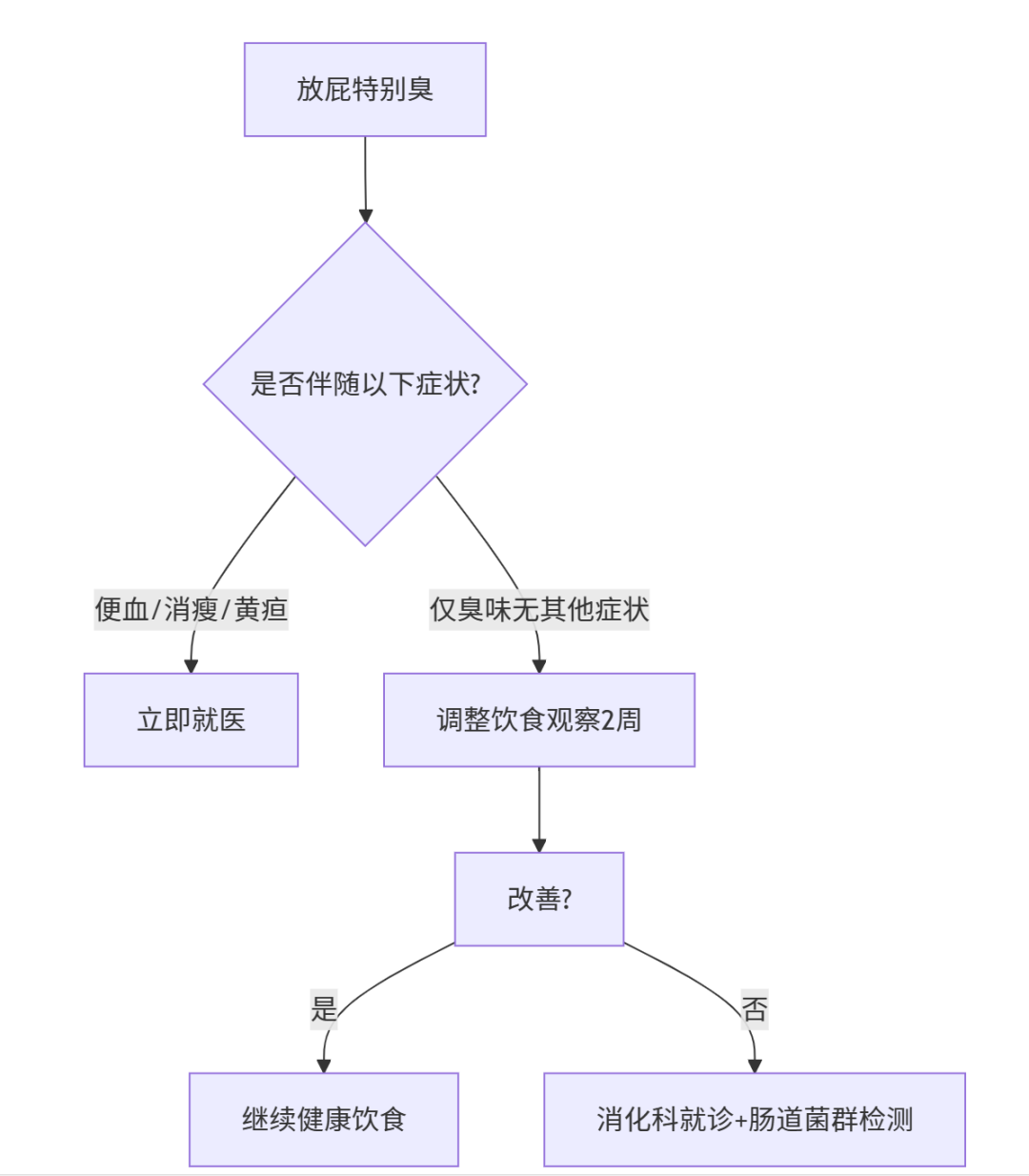 虽然单纯放屁增多不一定是疾病的标志,但周家铭提醒,我们仍需警惕一些伴随症状,如果放屁频繁同时伴随体重明显下降、便血、夜间腹痛等症状,则需要引起警惕,及时就医检查。