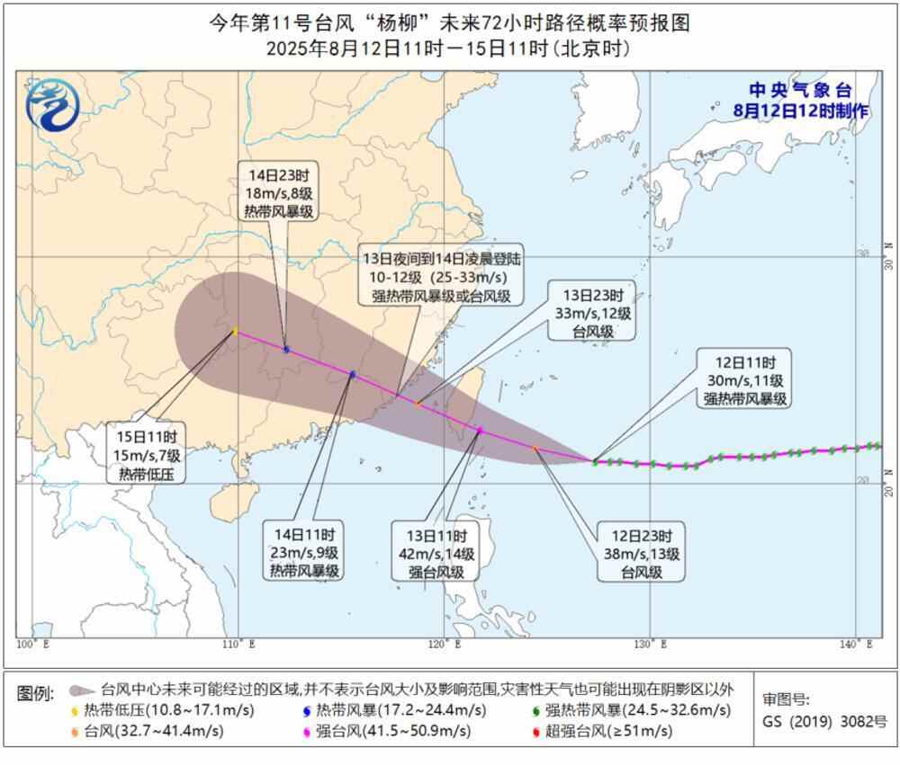 截至8月12日中午,今年第11号台风“杨柳”,仍处于逐渐向台湾东南部沿海靠近的阶段。中央气象台预计,“杨柳”将先在13日中午前后登陆台湾东南部沿海,再于13日夜间至14日凌晨登陆福建南部到广东东部一带沿海;也不排除经过台湾岛南部海面后,在闽粤交界一带沿海登陆的可能。截至12日中午,广东东部市县已发布台风白色预警信号,提醒公众注意台风即将来袭。