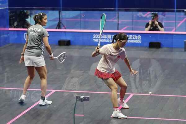 8月8日,成都世运会壁球项目在成都高新体育中心开赛。图为本届世运会年龄最小的运动员殷子媛(右)迎战日本选手渡边聪美。视觉中国供图