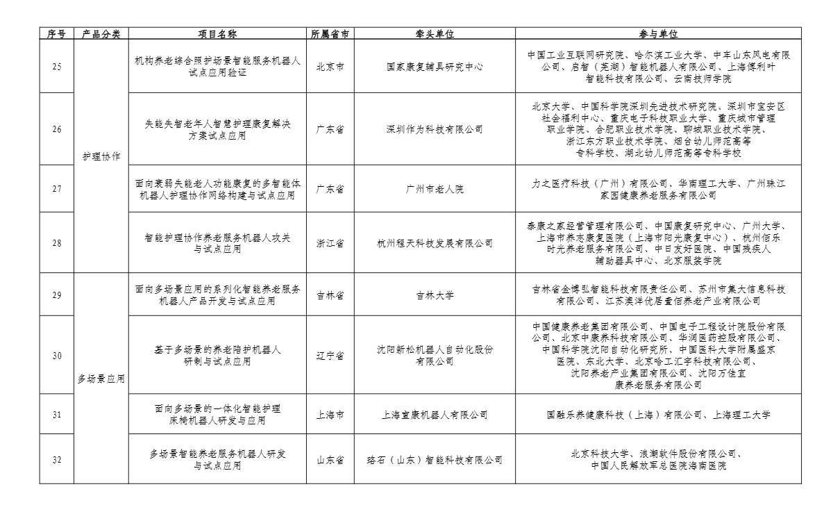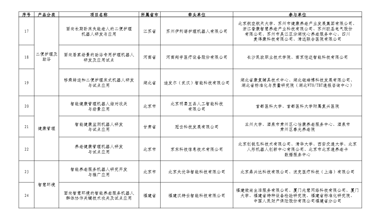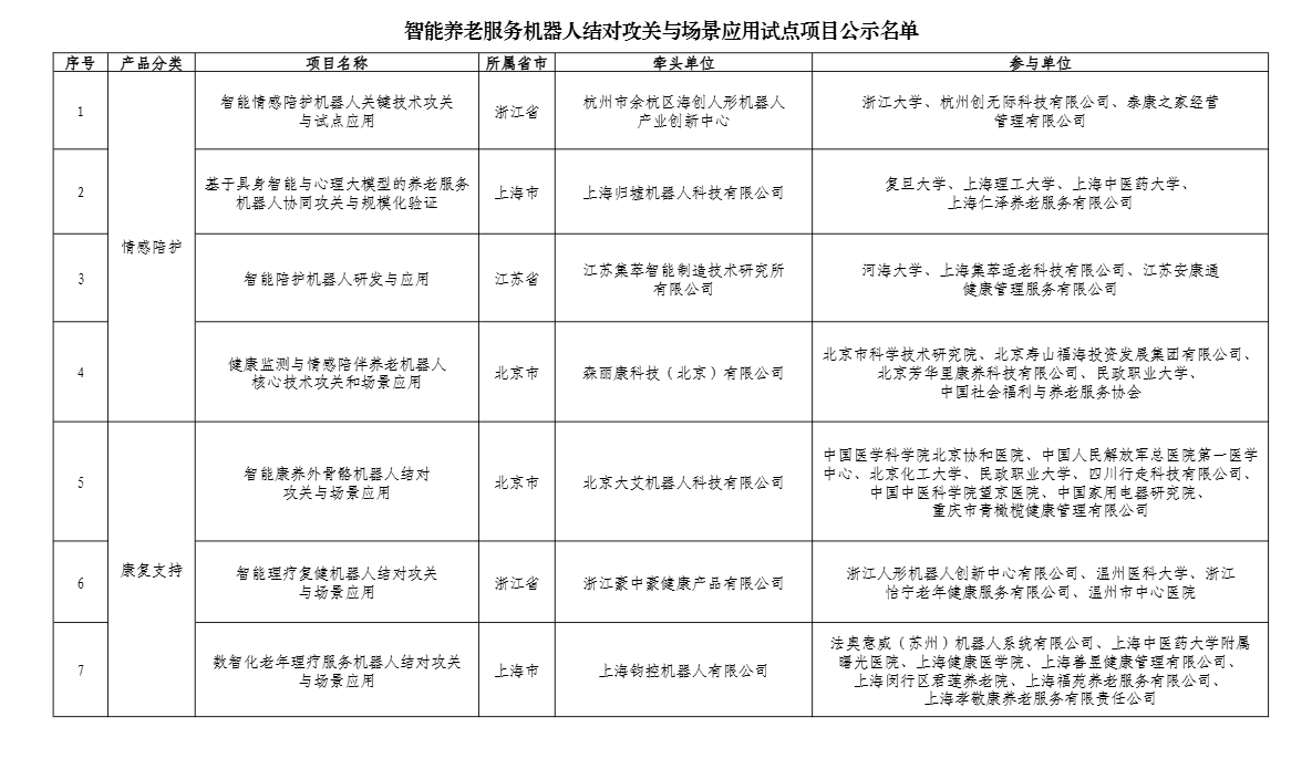 广东入选项目分别为自变量机器人科技(深圳)有限公司牵头的面向生活照料的智能机器人研发与应用验证,广州柔机人科技有限公司牵头的失能老人多机协同离床转运护理康复机器人系统研发与应用推广,中国科学院深圳先进技术研究院牵头的智能脑认知评估训练与康复助行机器人研发与试点应用,深圳作为科技有限公司牵头的失能失智老年人智慧护理康复解决方案试点应用,广州市老人院牵头的面向衰弱失能老人功能康复的多智能体机器人护理协作网络构建与试点应用。