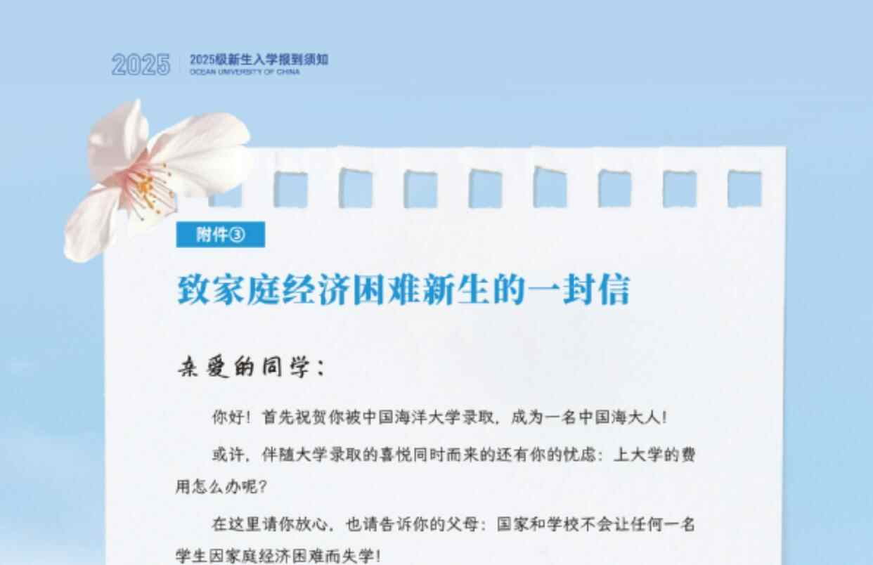 致家庭经济困难新生的一封信。图/中国海洋大学