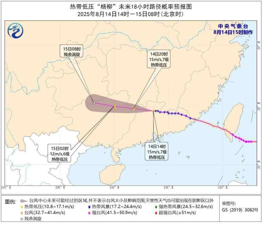 中央气象台预计,8月14日8时至15日8时,东海南部、台湾海峡、南海东北部、巴士海峡、台湾岛北部和南部沿海、福建中南部及沿海、广东东部及沿海、江西南部将有5~7级风,其中福建南部沿海、广东东部沿海、台湾海峡南部海域风力可达8级、阵风9~10级。广东大部、广西大部、福建东南部、江西南部、湖南中南部和西北部、贵州东部等地有大到暴雨,部分地区大暴雨,其中广东北部、广西东北部、湖南南部、江西西南部等地局地有特大暴雨(250~280毫米)。上述部分地区伴有短时强降水(最大小时降雨量20~50毫米,局地可超过70毫米),局地有雷暴大风等强对流天气。