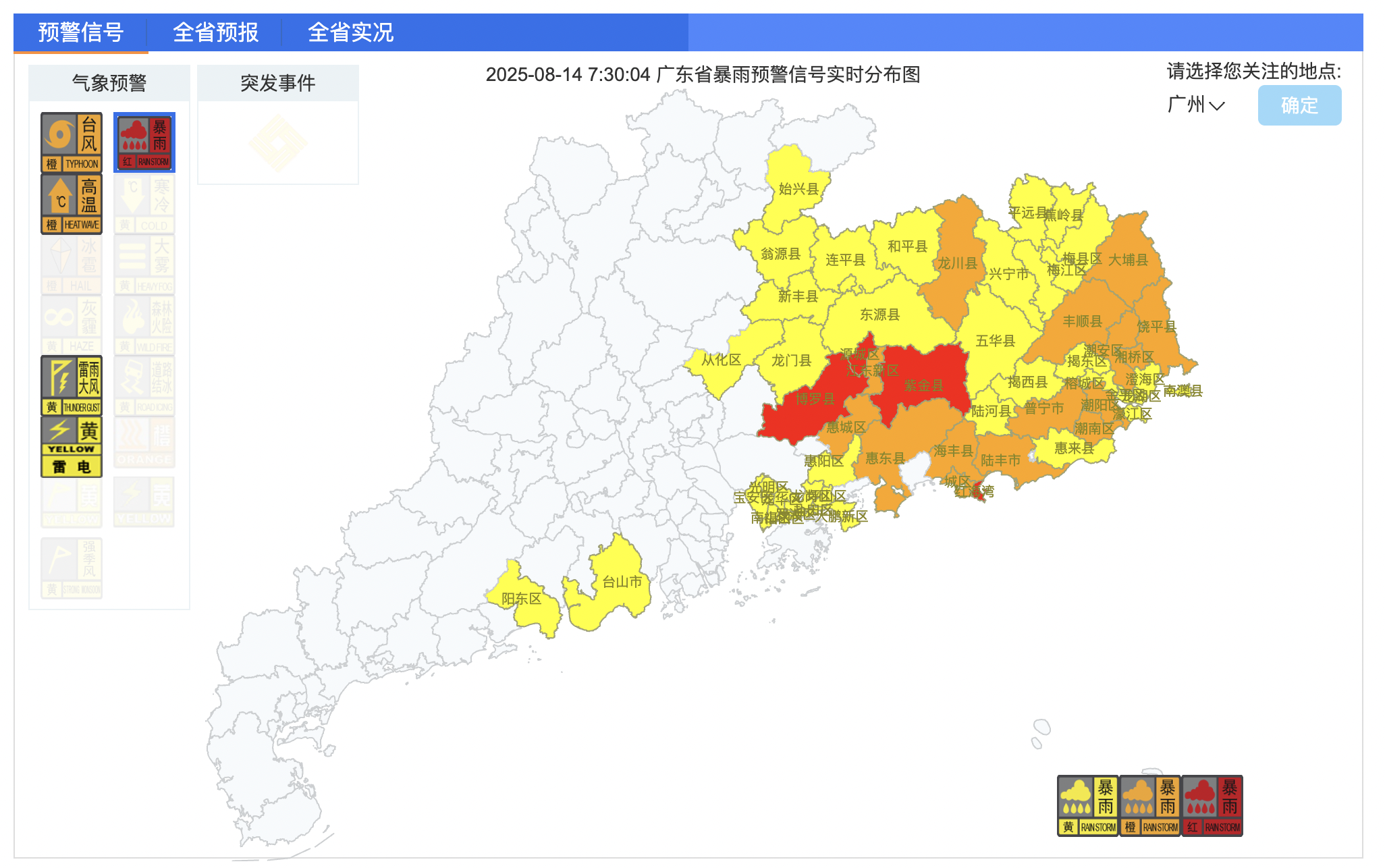 “杨柳”强度减弱,雨势不弱。从广东气象雷达图上看,截至14日7时24分,大半个广东正受“杨柳”的雨带影响。截至14日7时30分,河源、梅州、汕尾等市,有市县区需要发布暴雨红色预警信号;梅州、揭阳、汕头、潮州等市,有市县区需要发布暴雨橙色预警信号;韶关、广州、深圳、江门、阳江等市,有市县区需要发布暴雨黄色预警信号。粤东沿海部分市县区,自13日夜间起已发布暴雨预警信号,截至14日早晨仍维持预警信号发布。