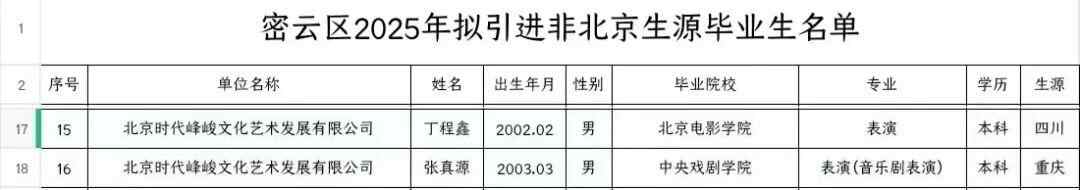 经用人单位考察推荐申报,密云区11家用人单位,2025年拟引进17名毕业生名单公示。名单中有来自北京电影学院表演专业的丁程鑫和中央戏剧学院表演(音乐剧表演)专业的张真源,二人均为时代少年团成员,单位名称为北京时代峰峻文化艺术发展有限公司。
