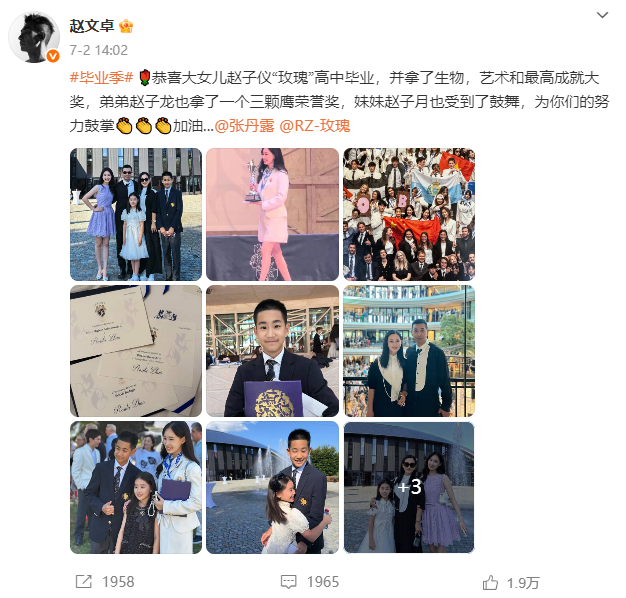 2025年7月,赵文卓曾晒出一家人合影,称“恭喜大女儿赵子仪高中毕业,并拿了生物、艺术和最高成就大奖,弟弟赵子龙也拿了一个三颗鹰荣誉奖,妹妹赵子月也受到了鼓舞,为你们的努力鼓掌。”