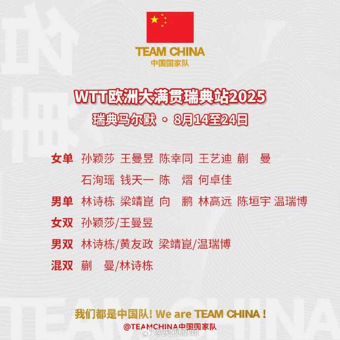 8月14日至24日,2025年WTT欧洲大满贯瑞典站将在瑞典马尔默举行。中国国家队发布国乒参赛名单。