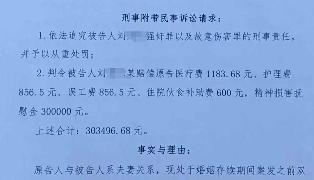 记者注意到,王丽在刑事附带民事起诉状提出了两点诉求:一是依法追究刘金强奸罪以及故意伤害罪的刑事责任,并予以从重处罚;二是判令刘金赔偿医疗费1183.68元、护理费856.5元、误工费856.5元、住院伙食补助费600元,精神损害抚慰金300000 元,合计303496.68元。