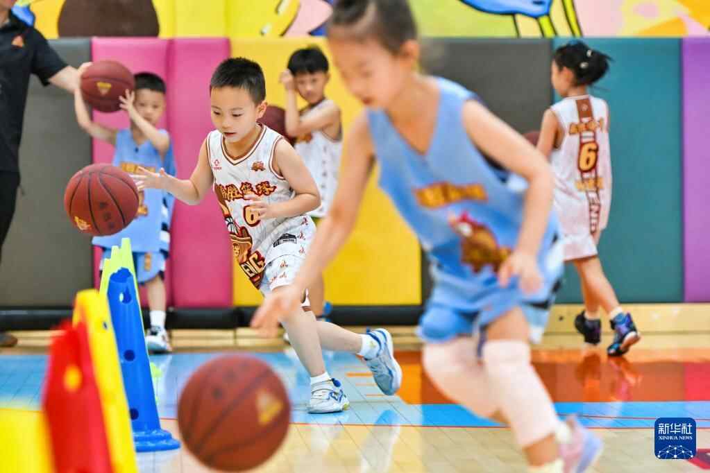 8月10日,小朋友在天津滨海文化中心篮球运动馆练习篮球。