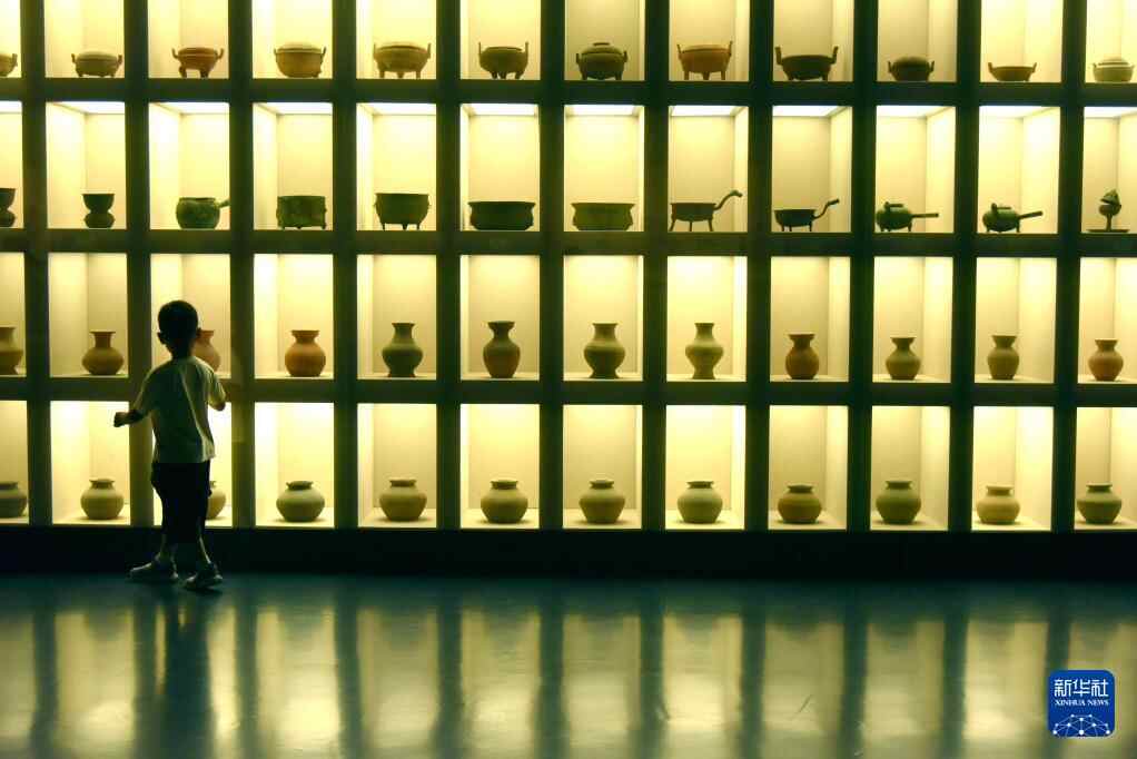 8月10日,家长带着孩子在甘肃省敦煌市博物馆参观文物展。