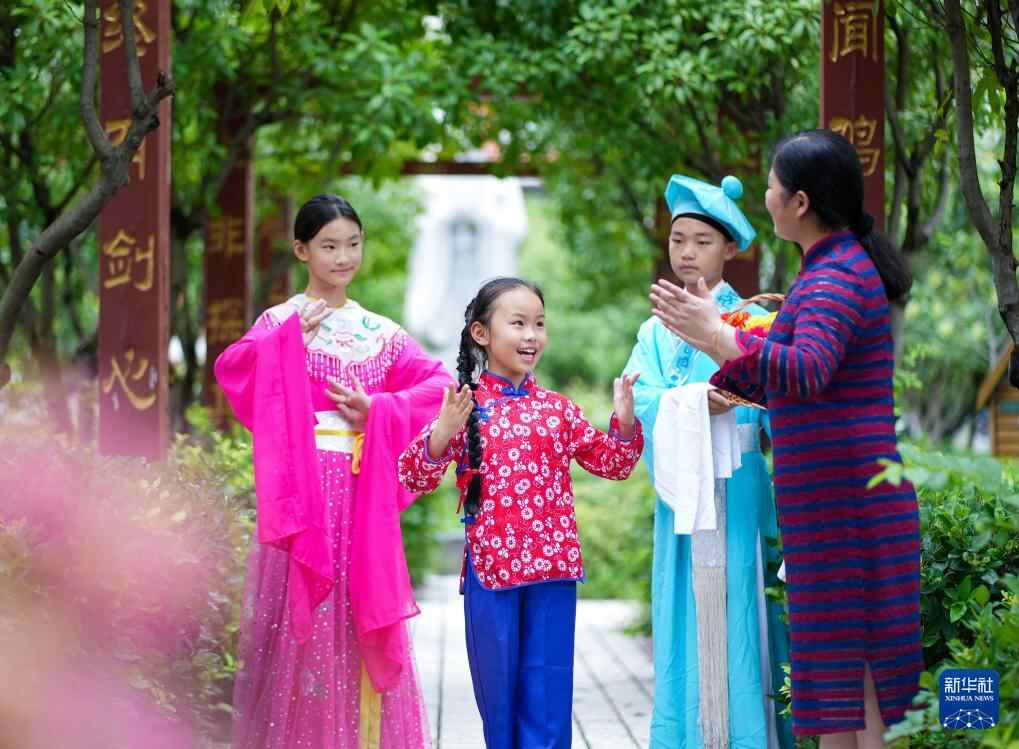 8月10日,在江苏省泰州市姜堰区城西小学的少儿戏曲公益暑托班上,老师指导孩子们练习戏曲基本动作。