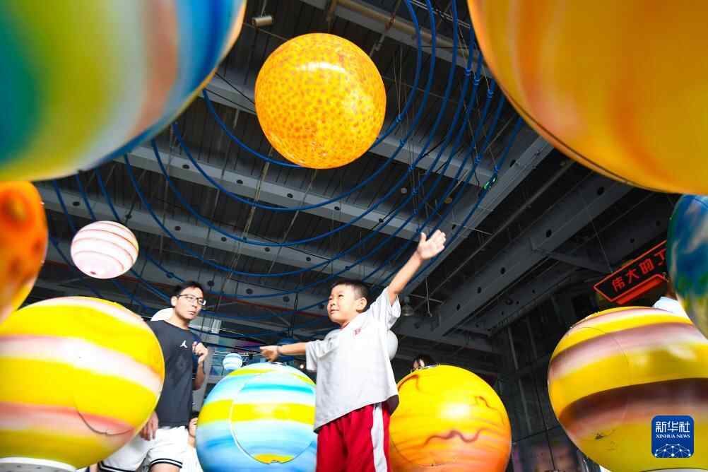 8月10日,在山东省青岛市城阳区景明学校,小朋友在气象科普馆体验人工降雨游戏。