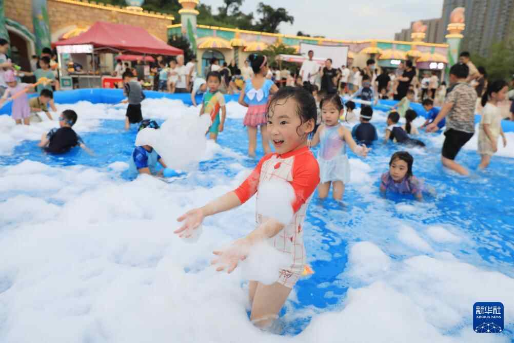 8月9日,小朋友在浙江舟山儿童公园参加“泡泡水仗大狂欢”活动。