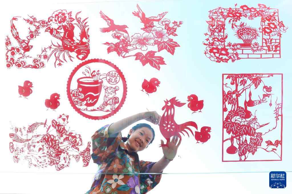 8月9日,河北省唐山市丰润区燕山路街道欣园社区,小朋友在制作剪纸作品。